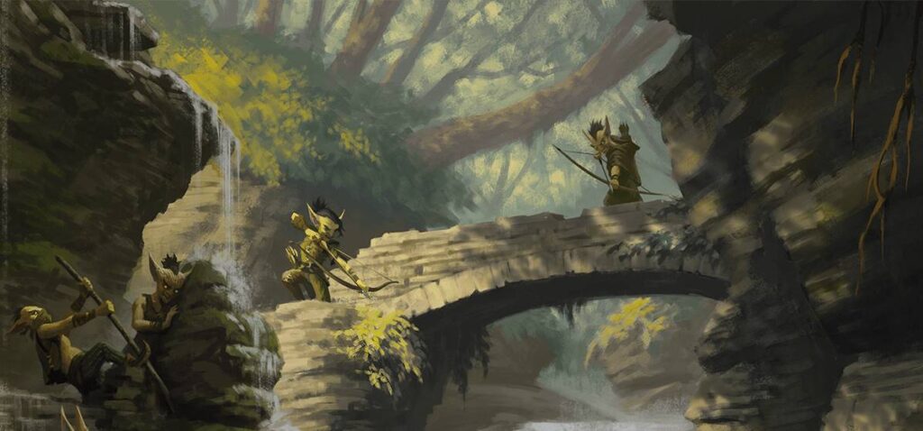 The team regrouped and headed for the bridge and whatever goblins remained within the caves. Just beyond the bridge a voice shouted out to them. “Truce, or this human dies!”