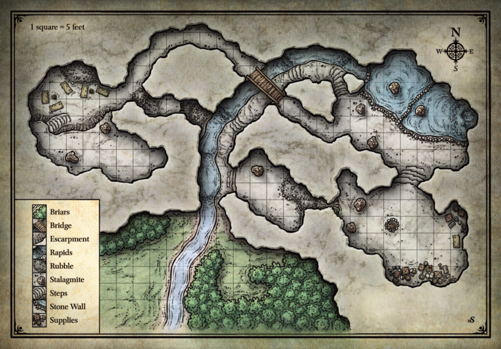 The goblins tried the “flash flood” trick a second time as the adventurers collected themselves, regrouped, and headed back in. This time around, the party was ready and the water didn’t flush them out of the cave. They advanced up the path and found